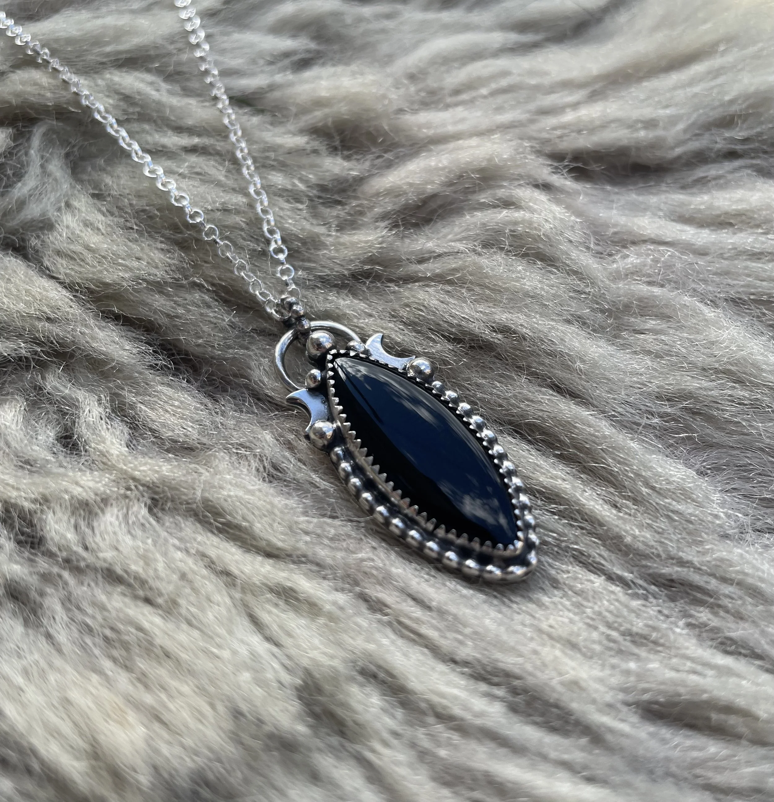 Description -Sterling silver pendant with a heart black onyx stone. Stone set with a beaded border.